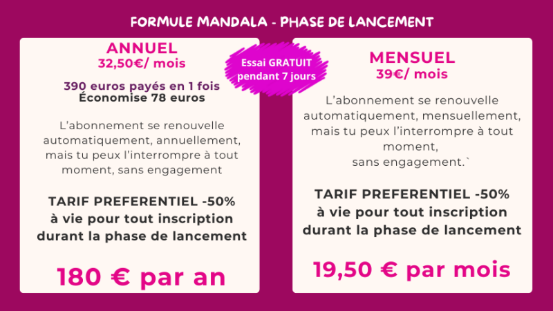 Possibilité d’élargir ton Mandala au fil du temps en basculant vers une Offre Mandala avec plus de programmes ou en intégrant un programme spécifique.