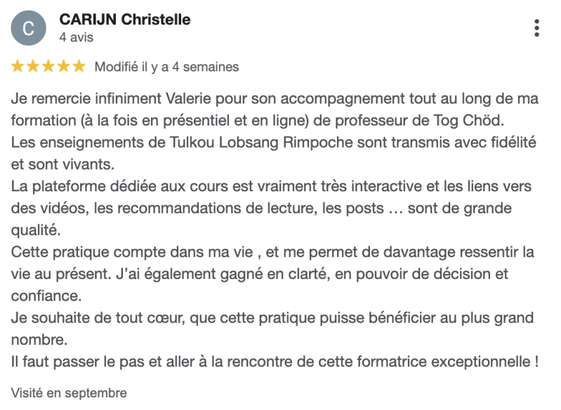 Je suis très contente de cette formation qui me permet de continuer mon chemin personnel et complète très bien mon activité professionnelle. S'agissant d'une formation en ligne, l'énergie, la rigueur et la grande volonté de transmettre de Valérie ont été très importants dans la réussite de mon apprentissage. J'ai confiance dans les enseignements reçus, je suis sure de leur qualité et de leur pertinence. Le déroulement de la formation, les étapes et les choses à faire ont été clairs dès le départ, ce qui permet de bien se projeter, de savoir ce qu'il y a à faire, de s'organiser.  Les enseignements sont denses avec beaucoup d'informations. Merci Valérie !